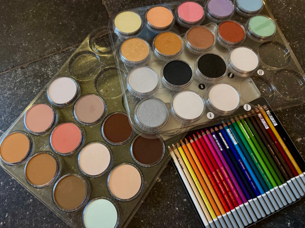Recently, I had purchased a new set of Pan Pastels containing new shades, including skin tones, pearlescent and metallic. And what a perfect opportunity here to try them out! I first sketched my angel with pastel pencils on a sheet of Clairefontaine’s Pastelmat in Anthracite, an almost black dark grey, a suitable choice as it let the gold wings and halo and pearlescent white dress pop out so beautifully, No fixatives needed on the Pastelmat as the teeth grips the colors so well. Besides, working with Pan Pastels is less messy as well which is a blessing, Easy peasy and less stressful!