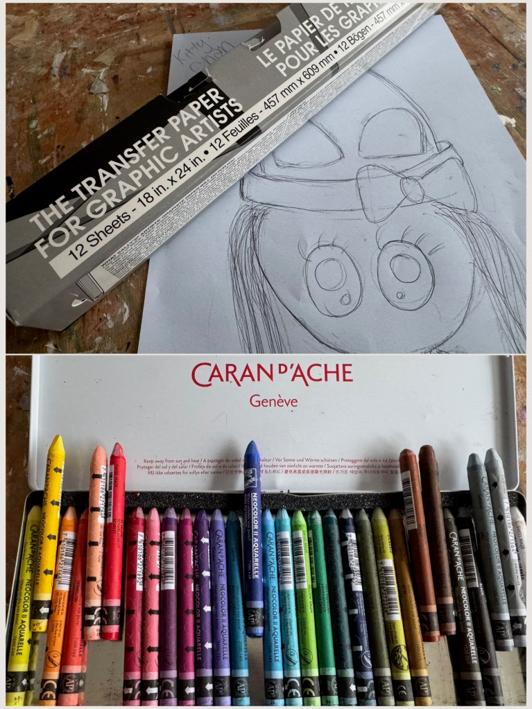 But then again I loved the original sketch so much that I wanted to keep that as well! So I came up with a brilliant idea: Why not duplicate it? First I made a photocopy of it then grabbed a sheet of graphite transfer paper (available on Amazon) and carefully traced over the photocopied version on a blank page in my sketchbook. The advantage of graphite paper is that unlike carbon copy paper, it is less messy and mistakes can be easily erased. Once the duplicate was done, I then began filling in the colors with watersoluble oil pastels, Caran d’Ache Neocolor II. A simple piece this time, but I enjoyed the cuteness of it. Perhaps next, I might use this photocopied “blue print” and produce a sweet acrylic painting version of it followed by some digital art too!