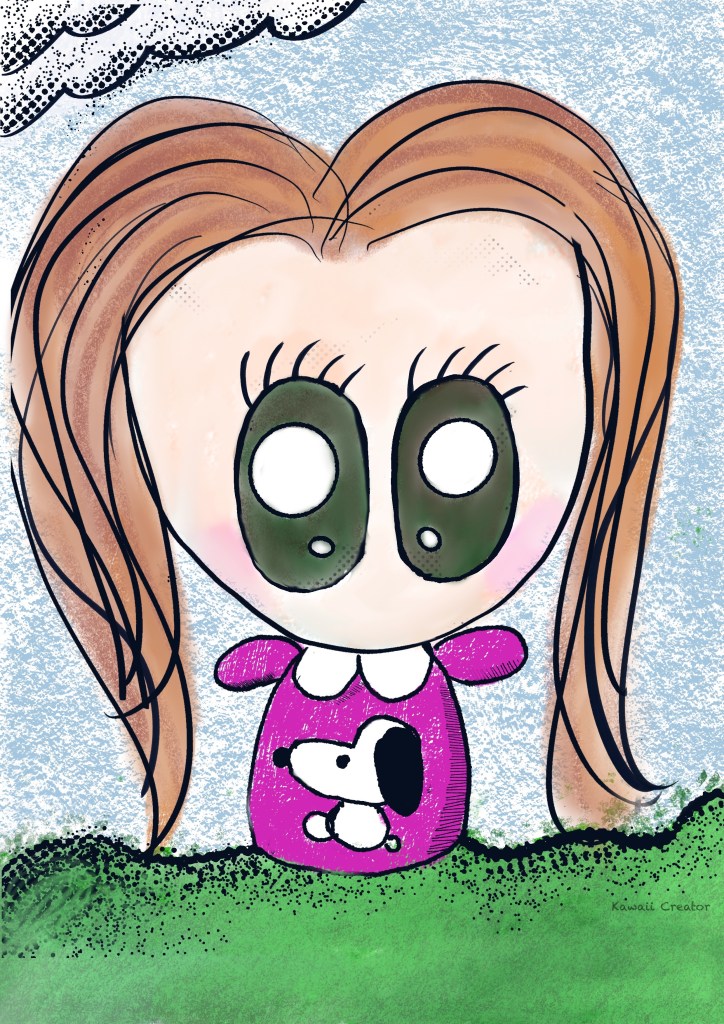 And now… I think we should give Little One the honor of wearing a kawaii Snoopy T-shirt to commemorate my emotional reunion with this our old adorable canine friend! That first Procreate doodle was merely to experiment with the new Comic brushes. So pleased with it that I thought I would develop it further and, well, color it all in using the FT Crayons brushes! Crayons definitely give that childhood memories vibe, don’t you agree? And of course, Little One is so thrilled to be able to have this honor. Have fun with Snoopy, Little One, I trust you!