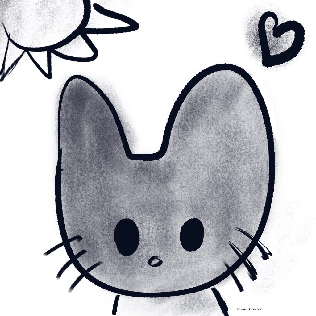 Now let’s make our cat happy enjoying the sun! Decided to make her a bit more rounded and more simple, firstly outlined with Mercury Ink. Filled her in with Vine Charcoal as if it were on its side for a light even finish. Nose and whiskers were drawn in with Charcoal Roll. 2B Compressed for filling in the heart and the sun, the latter with a lower saturation. How cute did she turn out!