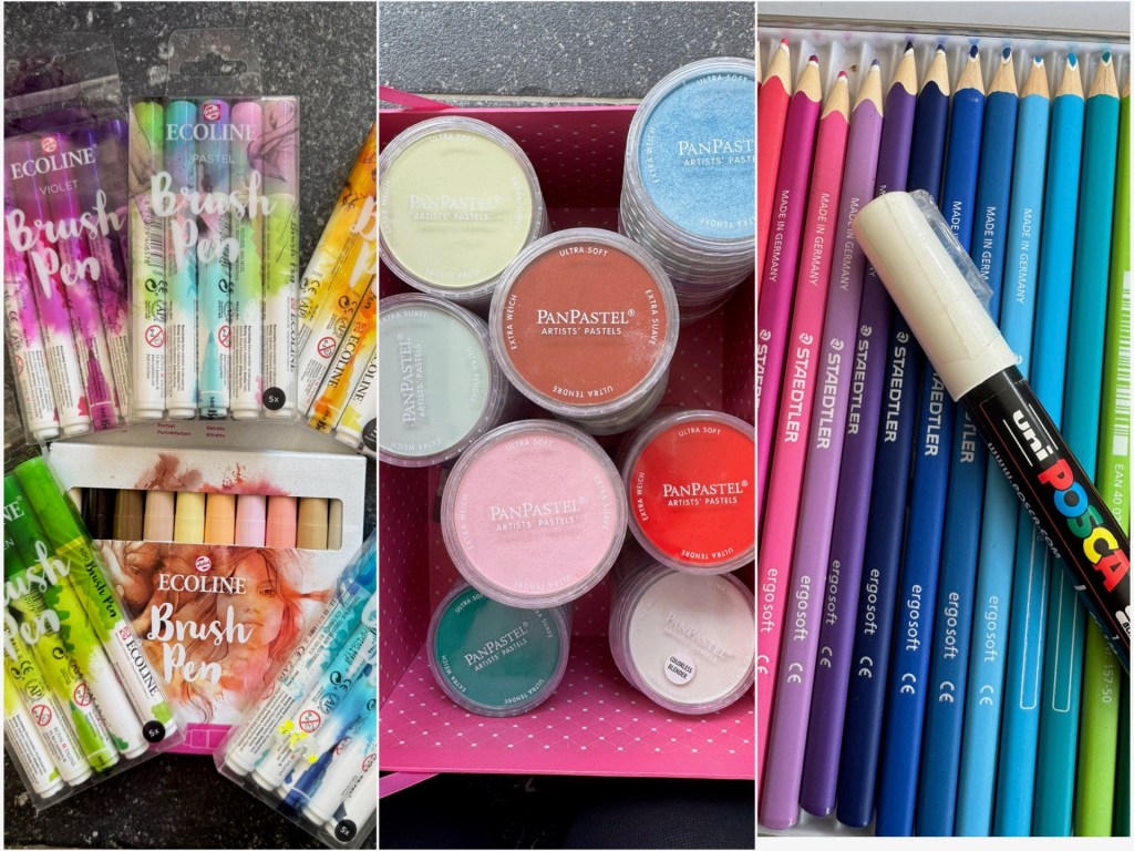 More practice with combining Ecoline pens with Pan Pastels! In between my Procreate tutorials, I try to stay “grounded” in the real world by painting in analog too. One of the things that stirred my curiosity was, “Can we introduce pastels in mixed media too?” Well of course we can! In particular, I was interested to see what else we could use Pan Pastels for apart from pure pastels drawings. Enter U.K. mixed media artist, Katie Moody, whom I discovered whilst googling, drawing my attention to her YouTube video. And what an eye-opener it was!