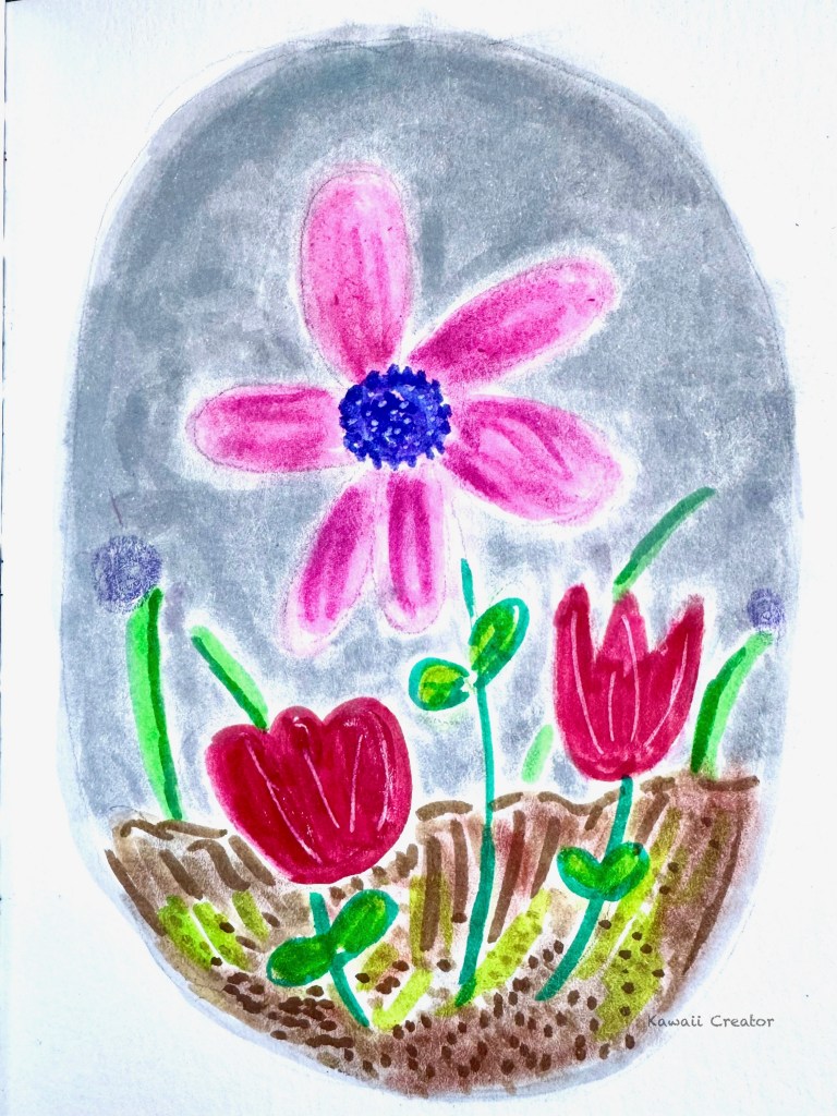 As the above, the flowers were firstly drawn and colored in with Ecoline Paintbrush. And here came a “beautiful mistake”. I firstly colored the sky light blue then changed my mind later and decided to cover it up with a darker blue Pan Pastel. Then realized it was too close to the violet of the smaller flower which would then disappear in the background. After a few trial and error, I came up with brown (raw umber?) and yes, that’s the one! It does resemble soil doesn’t it? The outlines of the plants were then enhanced with colored pencils and finer details drawn in with white Uni Posca Pen.
